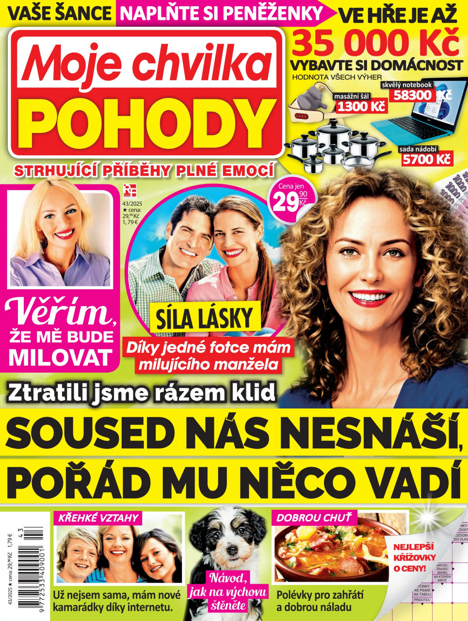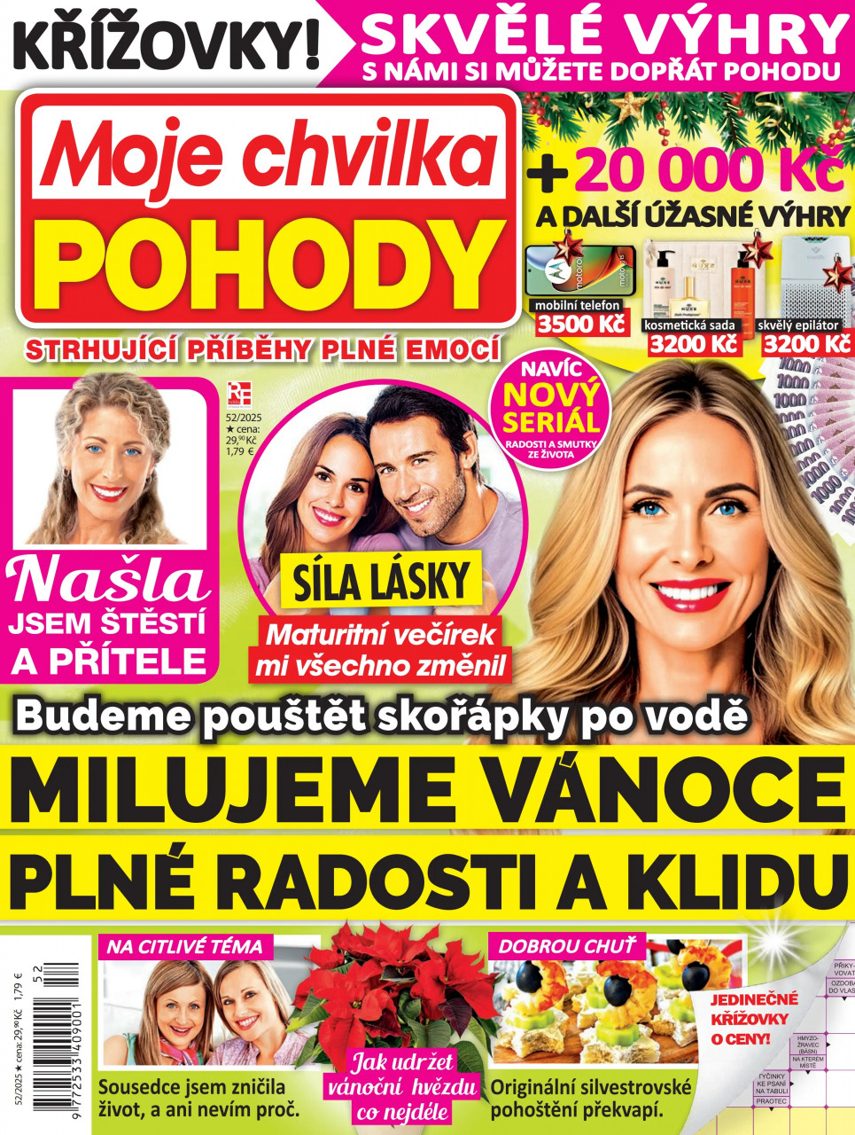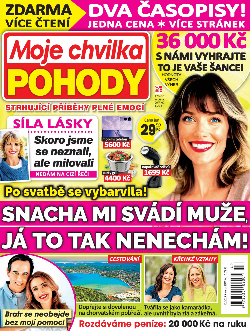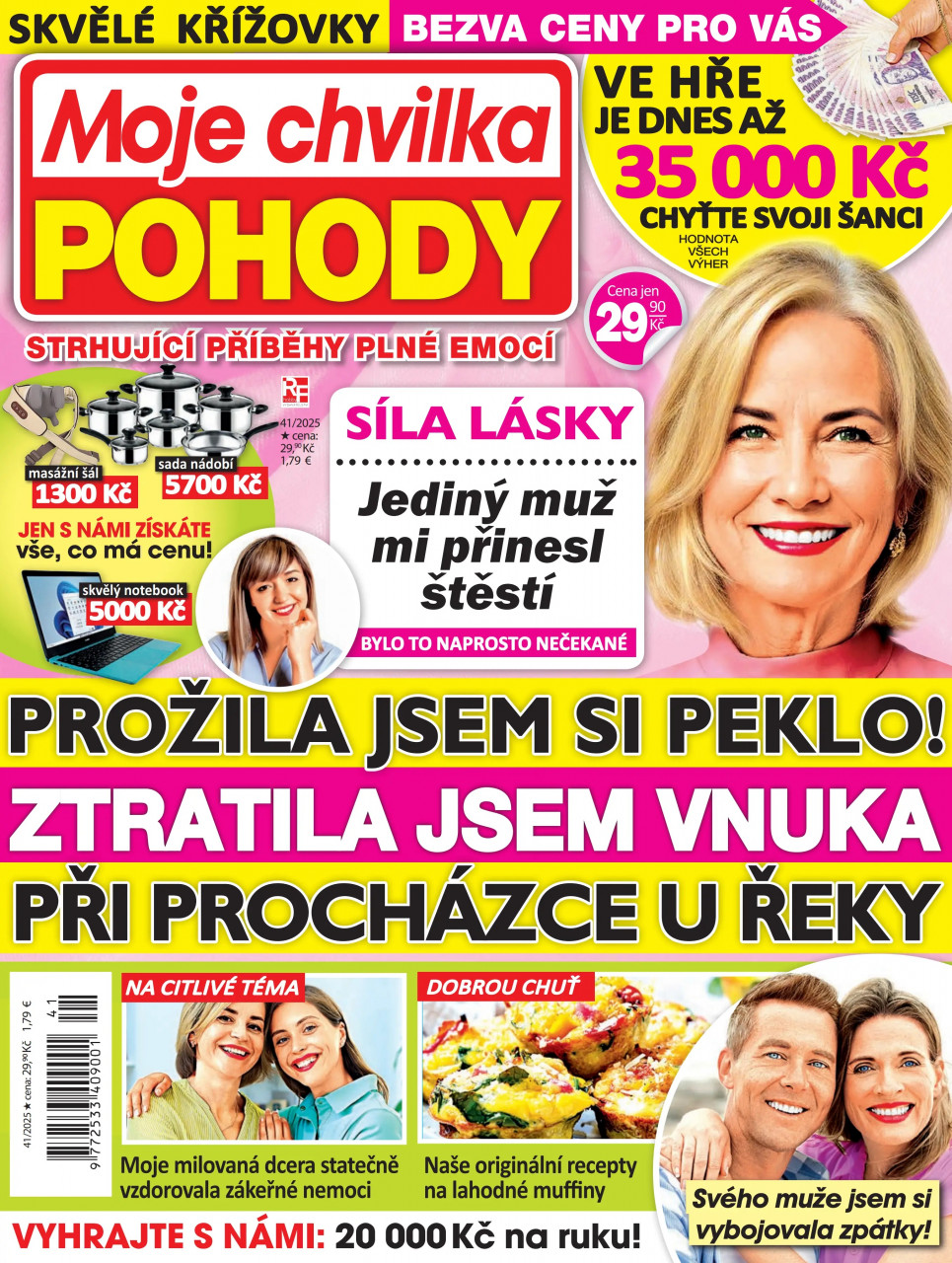 Týdeník Moje chvilka pohody patří mezi oblíbené časopisy pro ženy, kterým poskytuje zábavné i poučné čtení, křížovky a soutěže o ceny a další obsah! V každém čísle nechybějí příběhy známých osobností, zpovědi samotných čtenářek, módní rubrika s praktickými tipy a návody, dále odborné poradenství v oblasti životosprávy, recepty nebo rady pro zahrádkáře a chovatele zvířat.